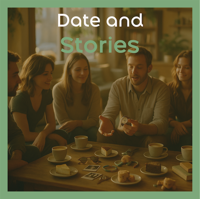 Sie zeigt ihr mitgebrachtes Foto oder Erinnerungsstück, legt es gut sichtbar auf den Tisch – und erzählt die Geschichte dahinter (ca. 2–5 Minuten).