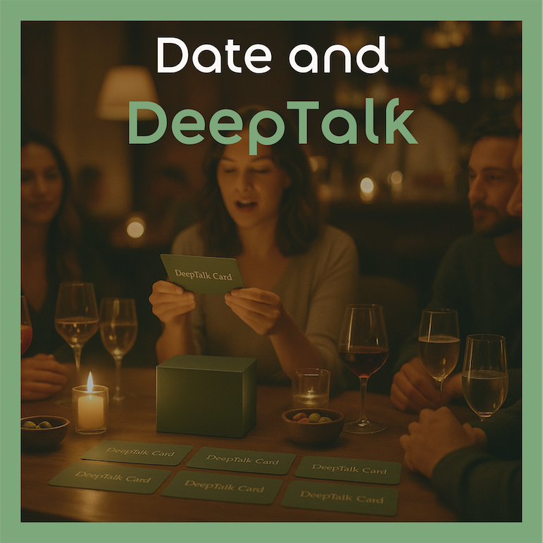 Auf dem Tisch liegen unsere DeepTalk Cards — Fragen, die ein Stück tiefer gehen, ohne zu privat zu werden.